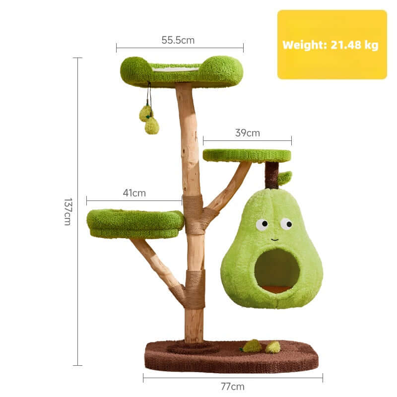 This pear-shaped multi-level cat tree is made from durable natural fruitwood and features three climbing platforms and an enclosed cat hammock. Designed as indoor cat furniture for multi-cat households, it provides a comfortable space for cats to play and rest.