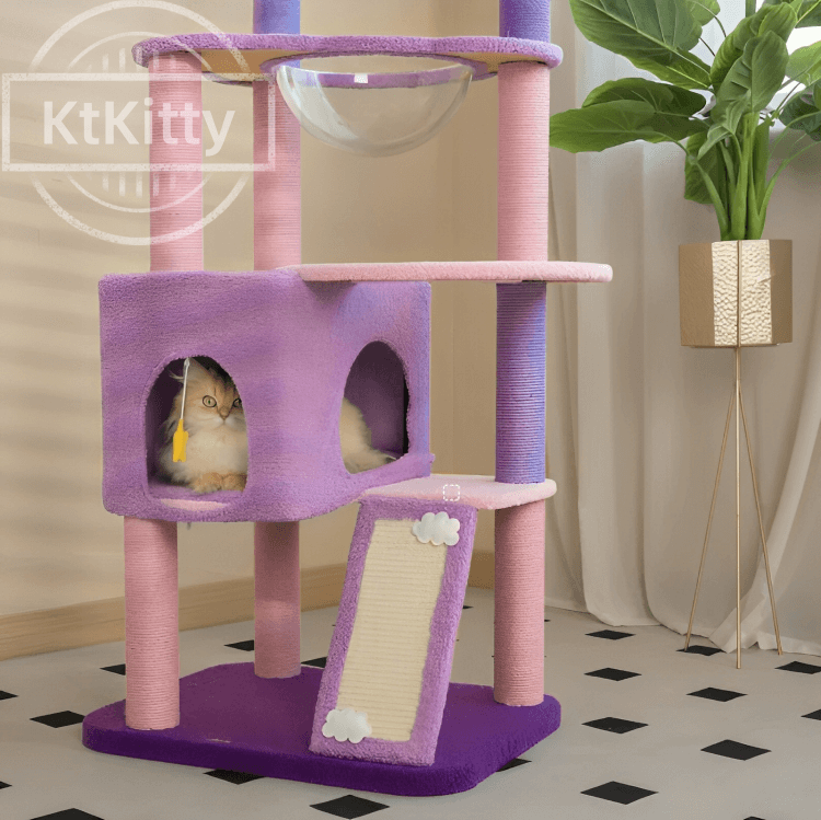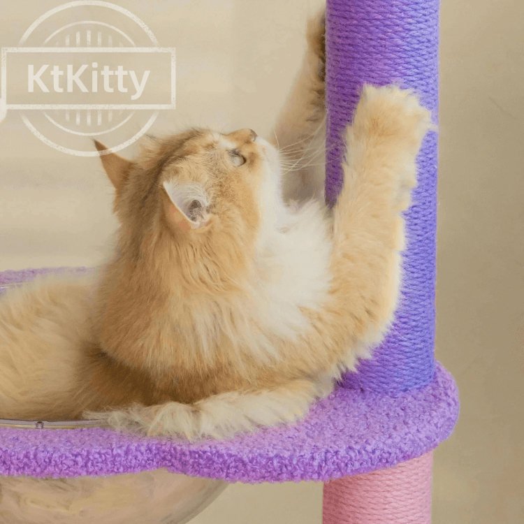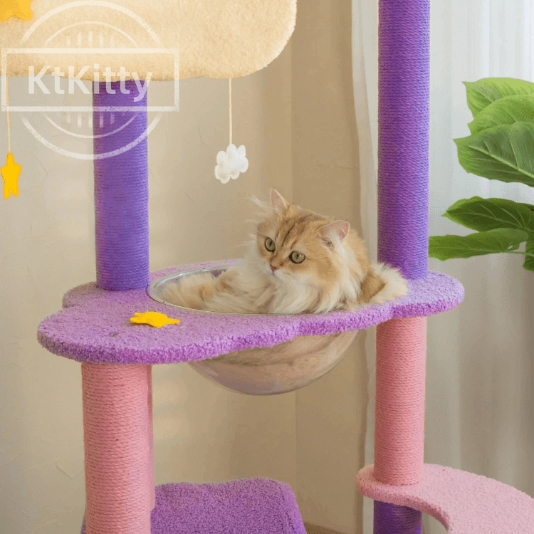 This transparent cozy cat nest Moonlight Cat Tree features a unique transparent cat nest and spacious condo. It offers a safe, comfortable resting space and lets cats relax while enjoying a 360ยฐ view.