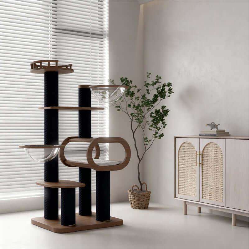 The top capsule bed is made from strong, clear acrylic. Cats love to curl up inside while still seeing the world around them. It gives them a warm, elevated spot to nap, yet still watch everything below. Owners also enjoy seeing their cat relax in a cozy bubble of sunlight.