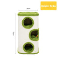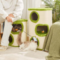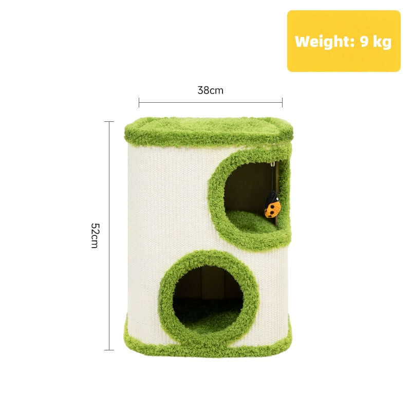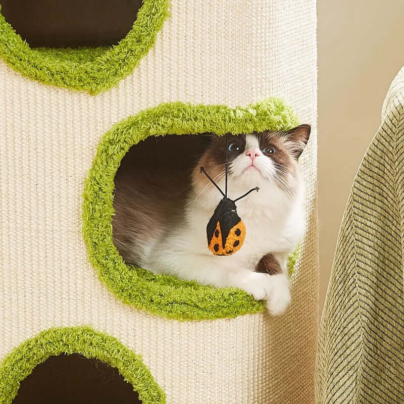 Three connected hideaways let cats climb, hide, and nap safely. The middle level features a dangling toy for play, while the top deck serves as a comfortable lookout.